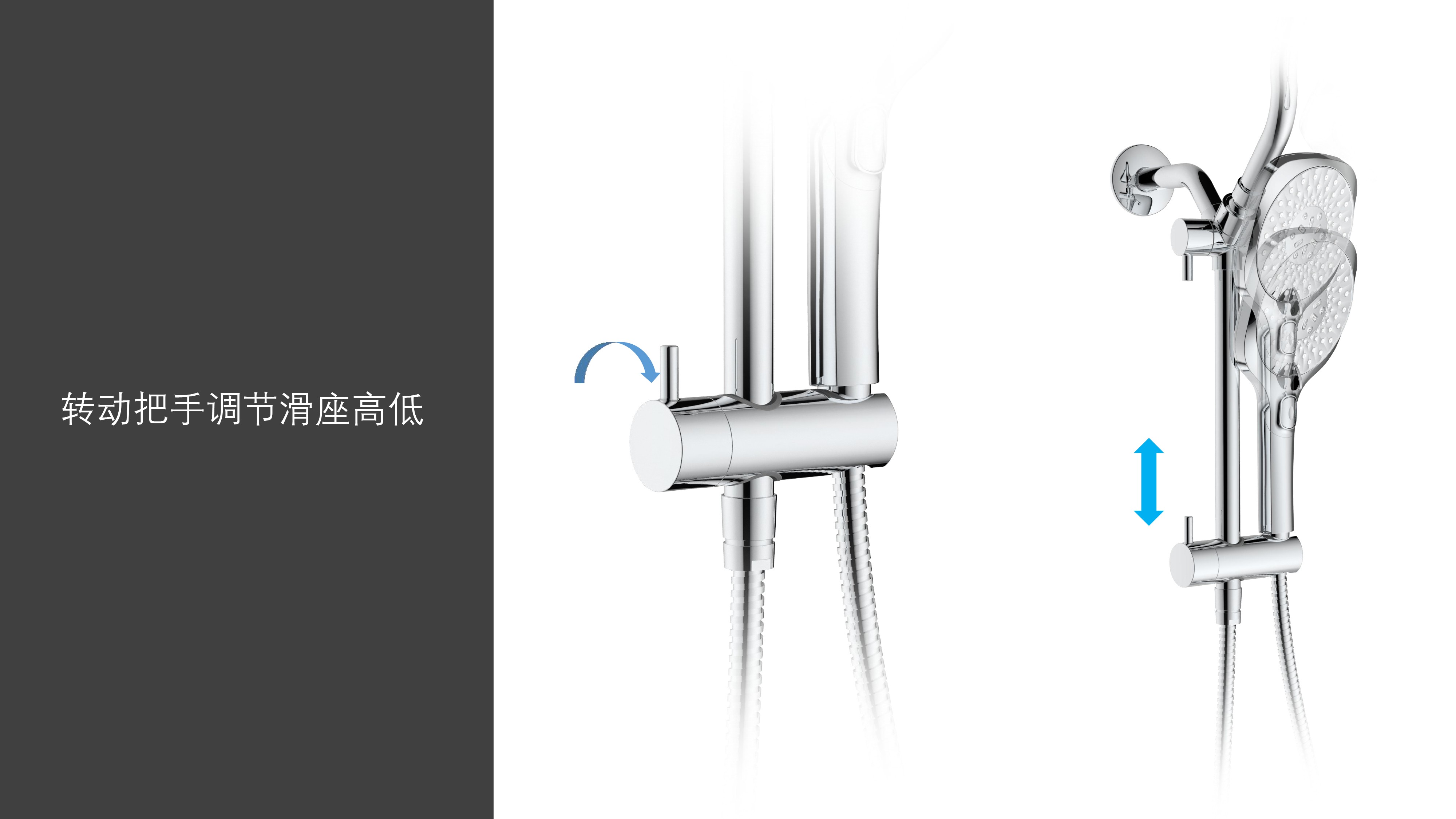 上出水彎管套裝;頂噴內(nèi)置球頭,可實現(xiàn)多角度旋轉(zhuǎn)調(diào)整;把手切換頂噴出水、花灑出水;轉(zhuǎn)動把手調(diào)節(jié)滑座高低;8功能出水花灑