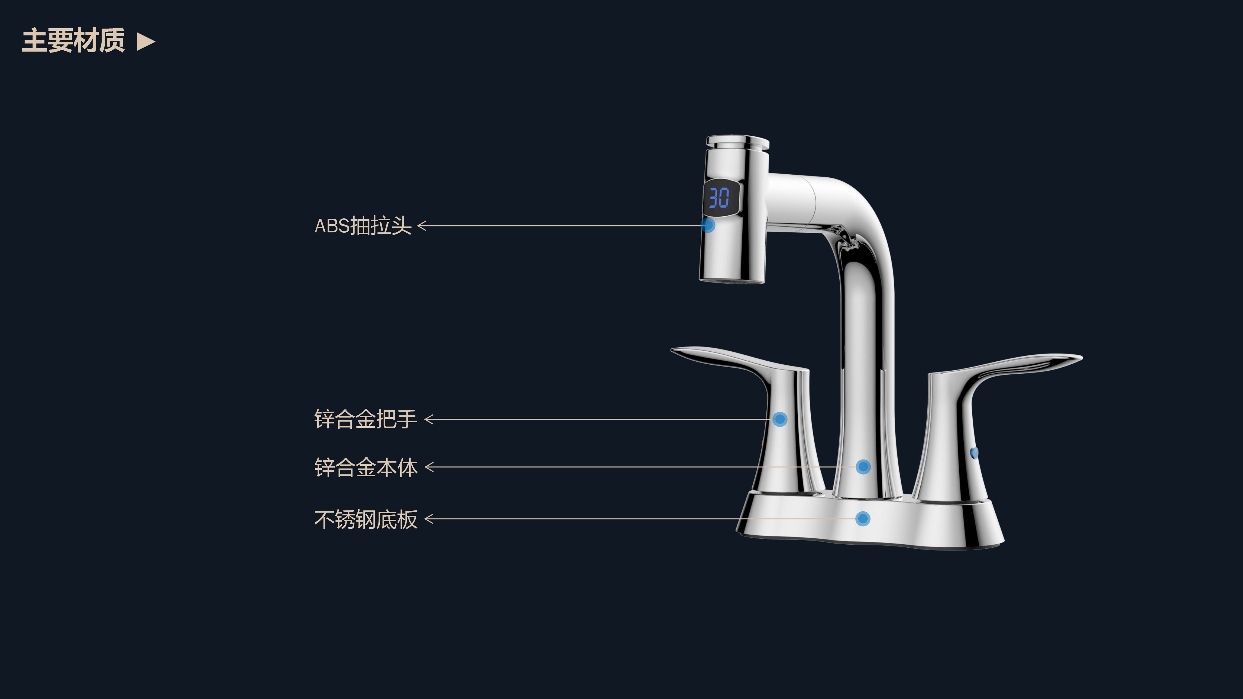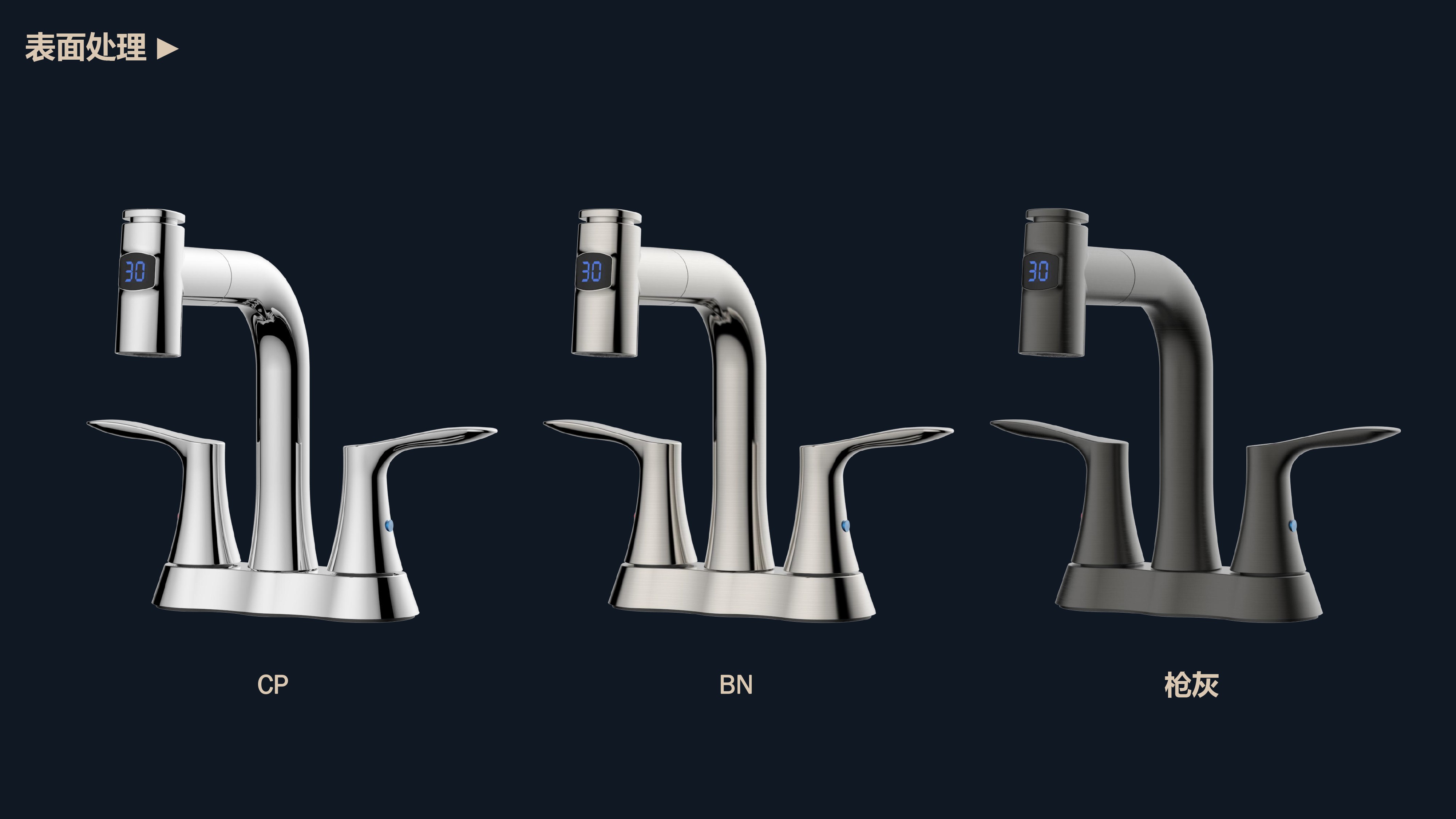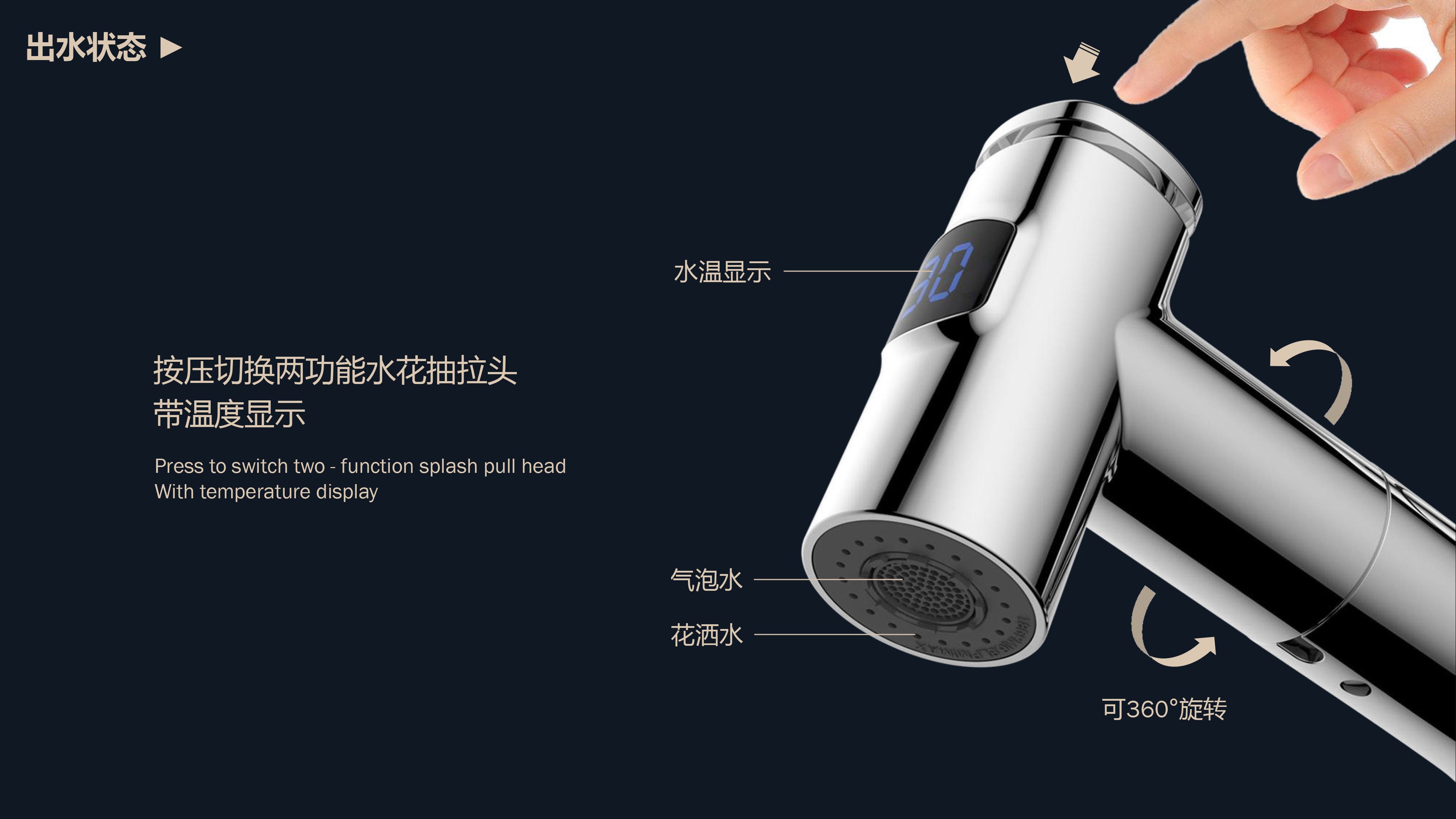 即時(shí)顯示溫度,安全防燙;日常洗頭利器,抽拉出水輕松洗;按壓切換兩功能水花;適合4寸3孔安裝臺面